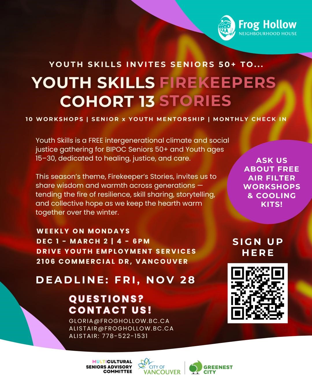 Youth Skills invites Seniors 50+ to Youth Skills Cohort 13 Firekeepers Stories. Youth Skills is a free intergenerational climate and social justice gathering for Seniors 50+ and BIPOC Youth ages 15-30. We are dedicated to healing, justice and care.