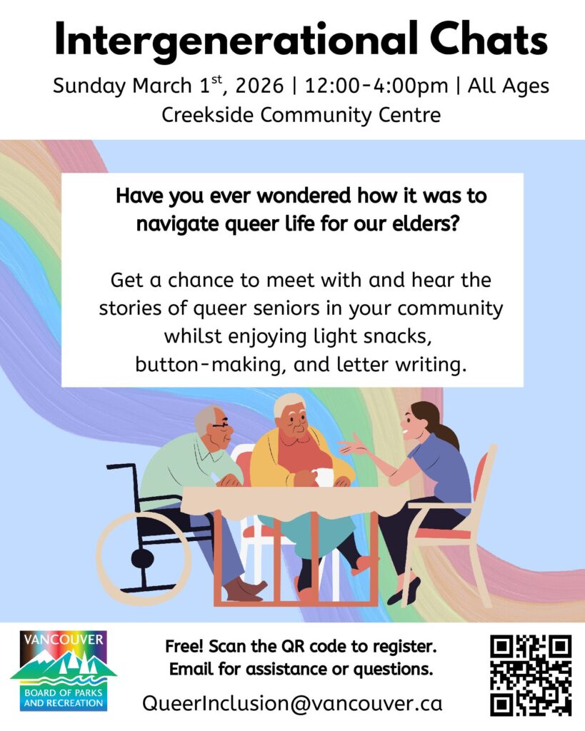 Join the Queer Inclusion team of Vancouver Parks Board for an afternoon of queer elder storytelling, Q&A, discussion, letter writing, button-making, and light snacks.