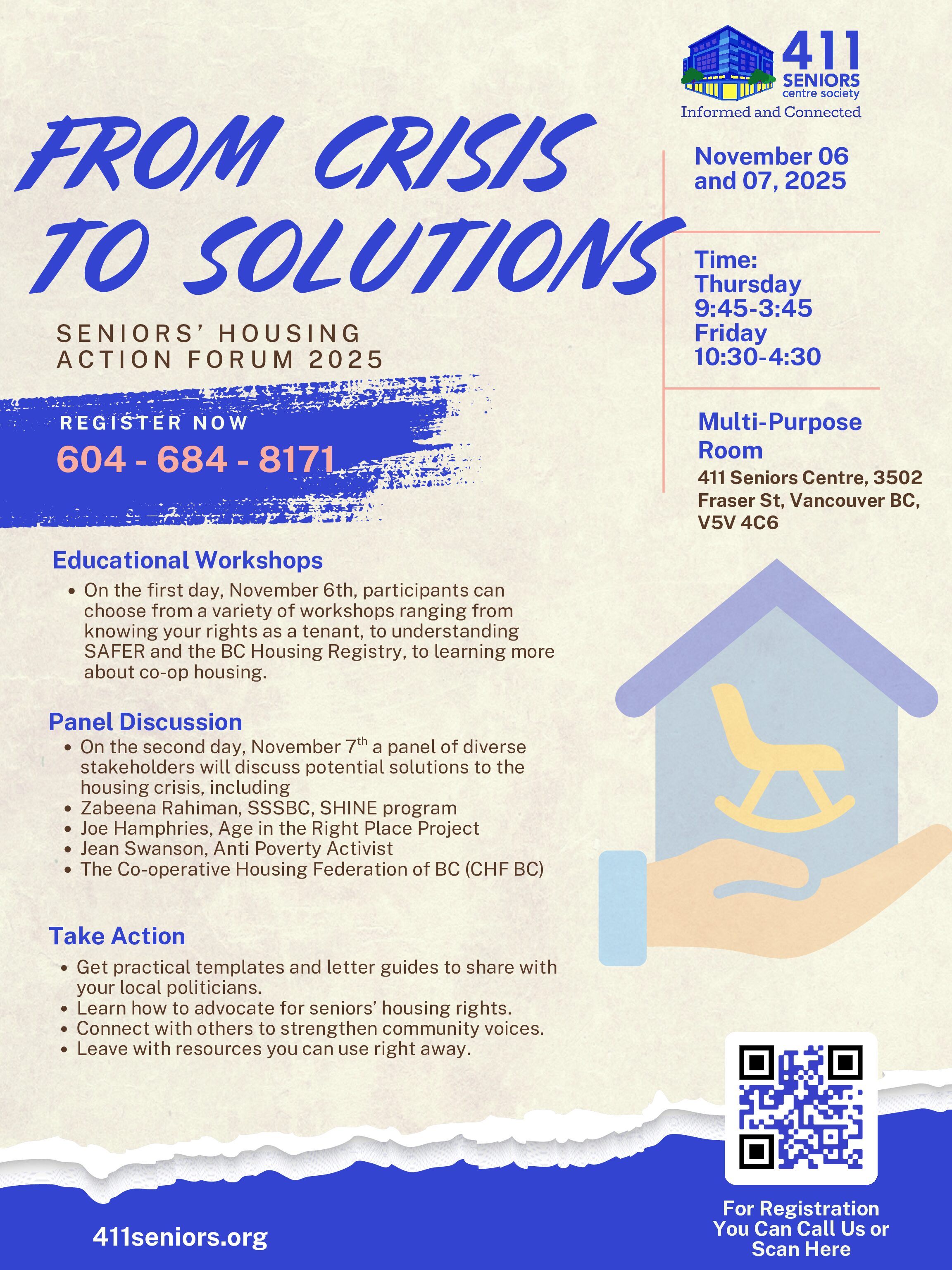 Thursday November 06, 9:45 – 3:45and Friday 07, 2025 from 10:30- 4:30411seniors.org411 Seniors Centre, 3502 Fraser St, Vancouver BC, V5V ...
